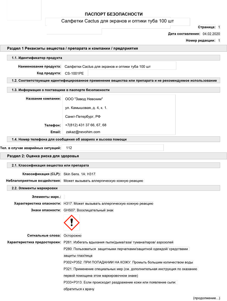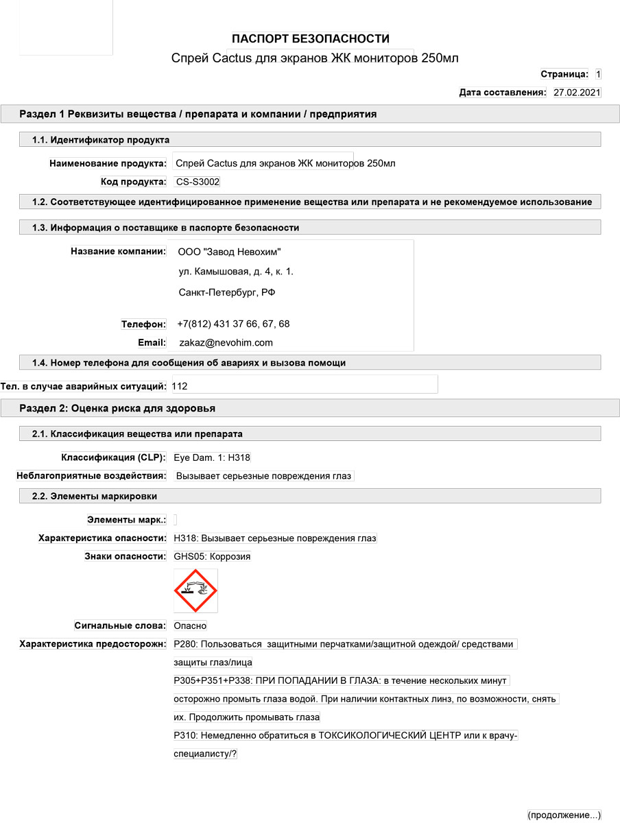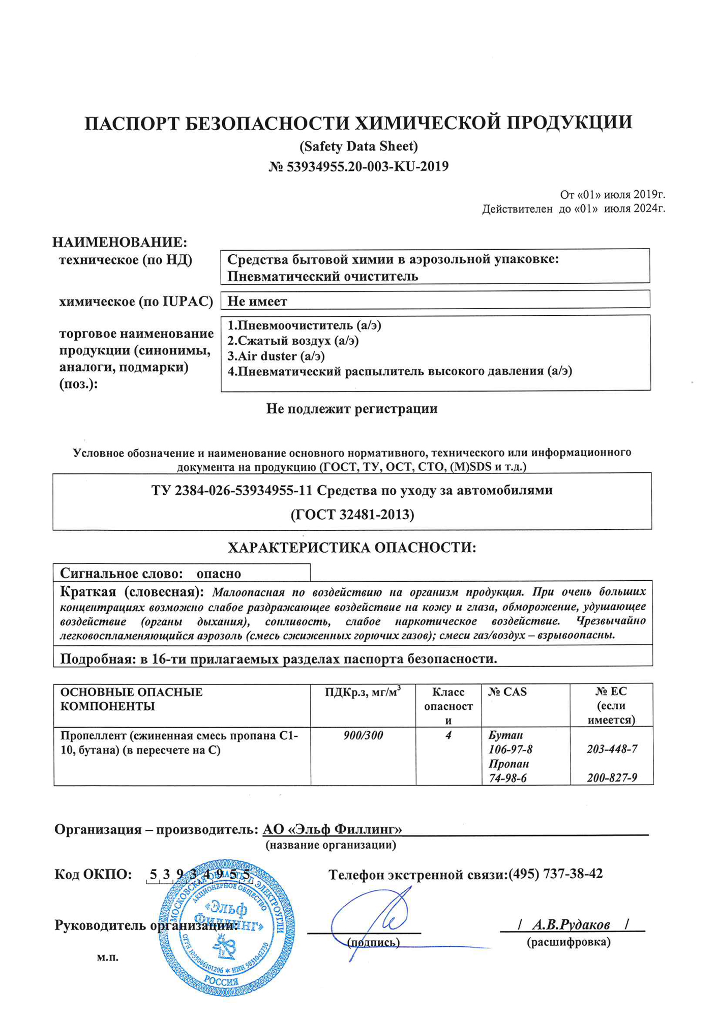 Паспорт безопасности Сжатый негорючий Чистящие средства. Свидетельство о