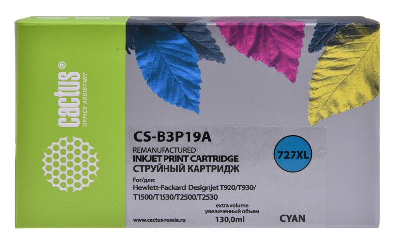 Струйный картридж Cactus CS-B3P19A (HP 727) голубой увеличенной емкости для HP DesignJet T920 ePrinter (CR354A), T930, T1500 ePrinter (CR356A), T1500 PostScript (CR357A), T1530, T2500 eMFP (CR358A), T2530 (130 мл)