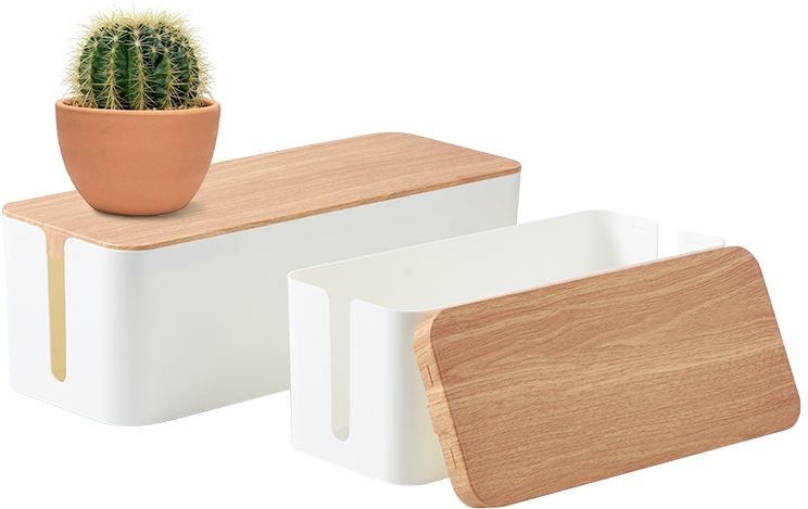 Корпус бокса выполнен из ударопрочного полистирола, а крышка из бамбука. В нашем ассортименте бокс для организации проводов представлен в двух цветах: черный и белый с крышкой из самого настоящего бамбука. Мы заранее позаботились о том, чтобы пользователям было удобно делать свой выбор: размер бокса Cactus подходит для самого распространенного удлинителя на 3 или 4 розетки.