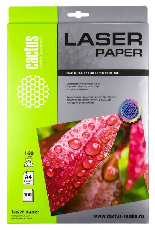 Фотобумага Cactus CS-LPA4160100 A4, 160г/м2, 100л, белая глянцевая для лазерной печати