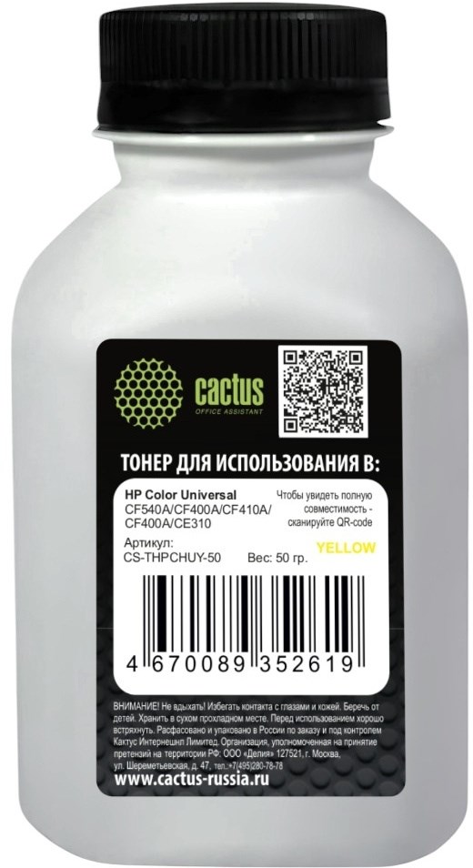 Тонер Cactus CS-THPCHUY-50 желтый флакон для принтера HP Color Universal CF540A, CF400A, CF410A, CF400A, CE310 (50 гр.)