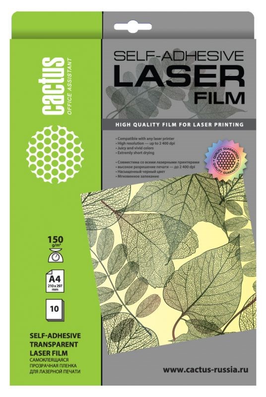 Пленка Cactus CS-LFSA415010 A4, 150г/м2, 10л, прозрачный самоклей. для лазерной печати