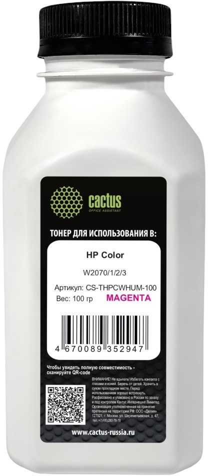 Тонер Cactus CS-THPCWHUM-100 пурпурный флакон для принтера HP Color W2070, 1, 2, 3 (100 гр.)