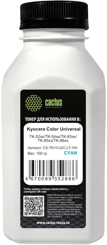 Тонер Cactus CS-TKYCU2C-LT-100 голубой флакон для принтера Kyocera Color Universal TK-52xx, TK-54xx, TK-83xx, TK-85xx, TK-88xx (50 гр.)