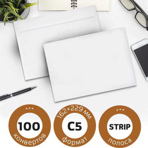 Конверты BRAUBERG С5 (162х229 мм), отрывная лента, внутренняя запечатка, 80 г/м2, комплект 100 шт.